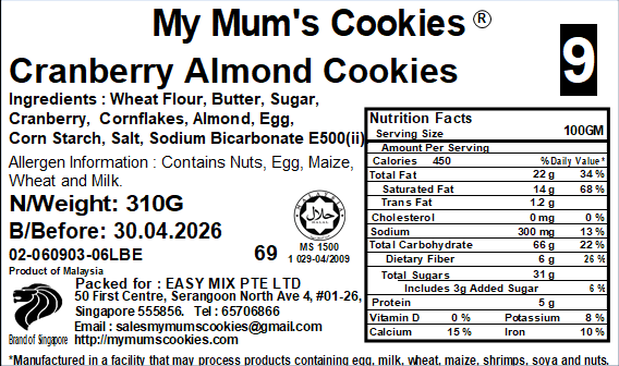 Made with cranberries, almonds and cornflakes, these multi texture cookies strives a good balance crunch and taste, with a rich almond aroma and the cranberries giving a refreshing freshness.